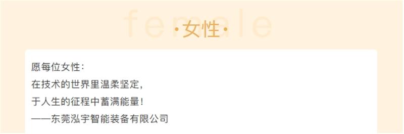 值此三八节,泓宇为每位女神送上定制女神礼盒,未来让我们一起开创“木兰智造计划”,以弹性工作制+技能升级通道,持续赋能女性成长。